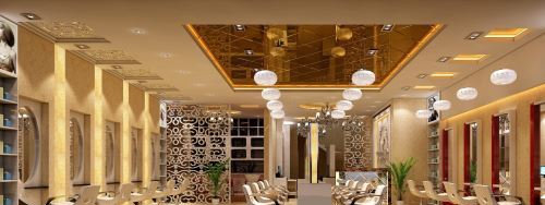 理發(fā)店的吊頂非常重要,因為顧客在洗頭時,最先看到的就是天花板。如果資金不充足,可以使天花板原有的線管等裸露出來,以顯示粗狂的原生態(tài),但是,這時燈光的選擇就極為重要,因為不吊頂?shù)脑?,天頂?shù)男Ч鸵揽繜艄鈦頎I造。所以,洗頭區(qū)的吊頂可以選擇溫和燈光的精致吊燈。在大廳就可以使用相對明亮點的。